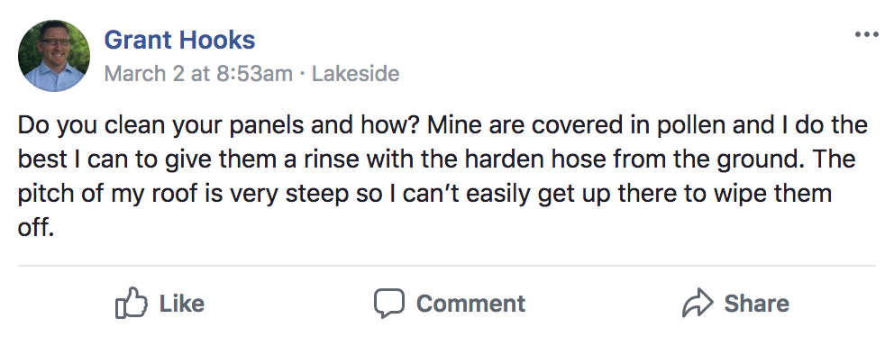 In the public Solar Discussion Group on Facebook, Grant asks how to clean pollen off the solar panels on his home in Lakeside, Florida.